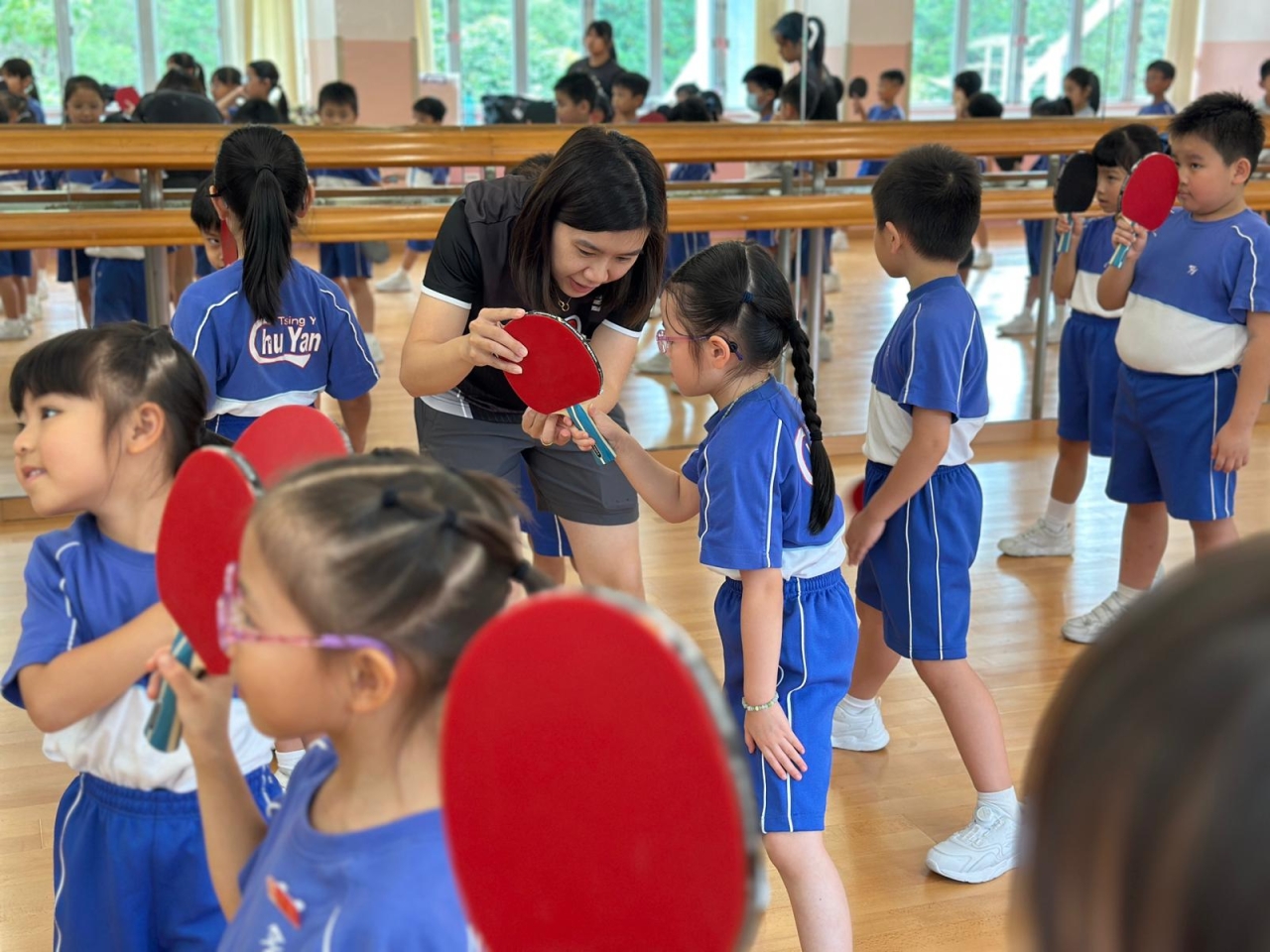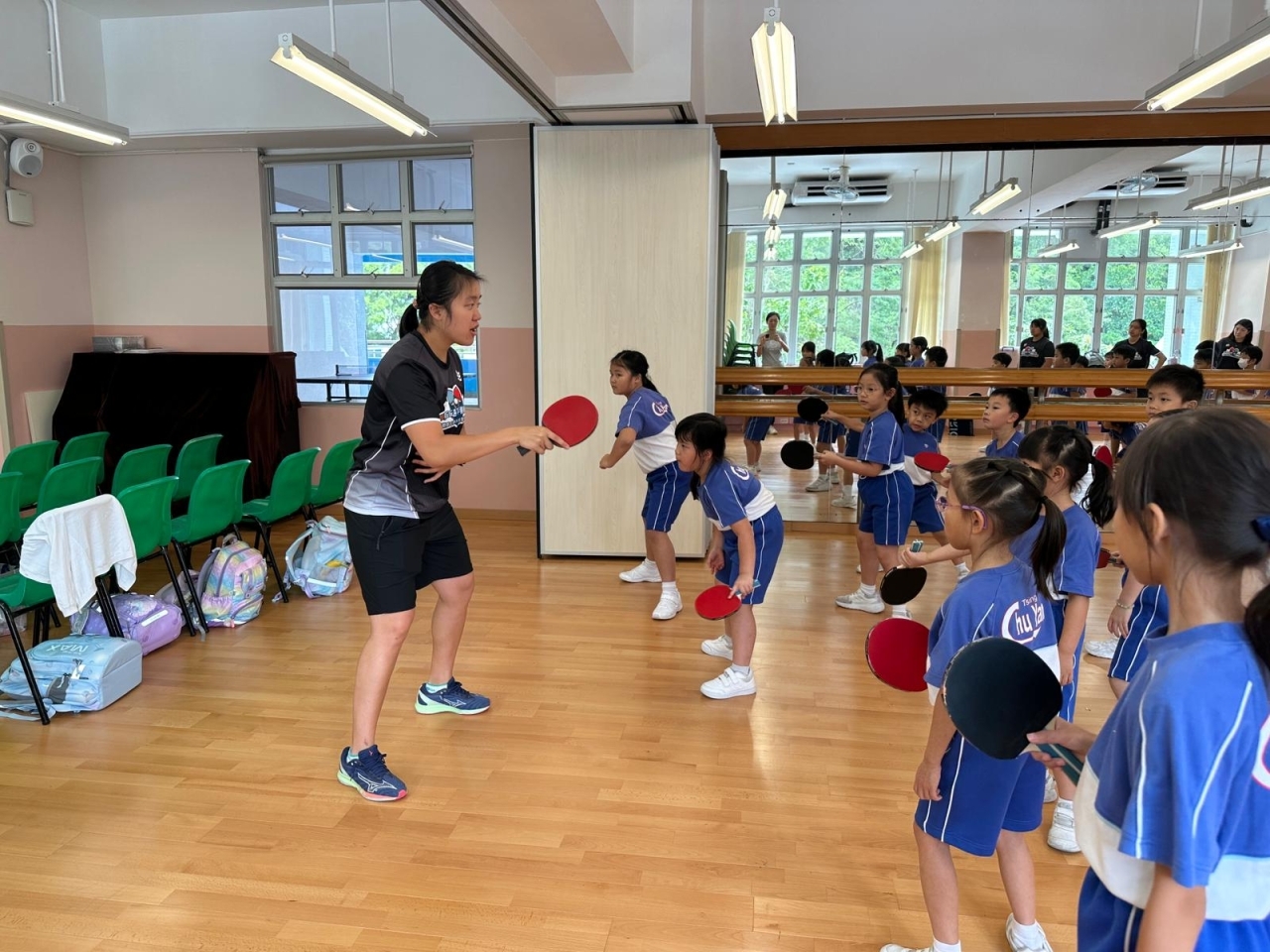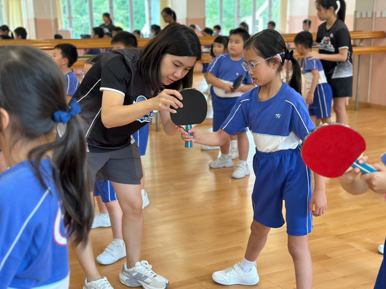 當天的體驗課中,李皓晴分享了自小接觸乒乓球運動的趣事。她與團隊亦親授本校30名一至三年級學生乒乓球基礎技巧,包括握拍姿勢、正手及反手接球技巧。教練團隊專業認真,學生們反應熱烈,表現主動投入,認真地學習乒乓球技巧,感受打乒乓球的樂趣。