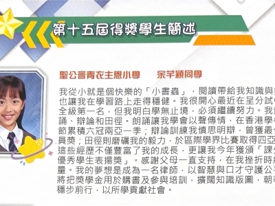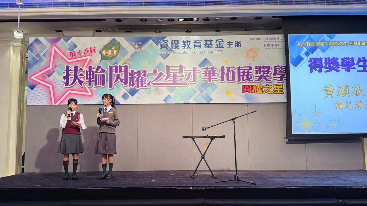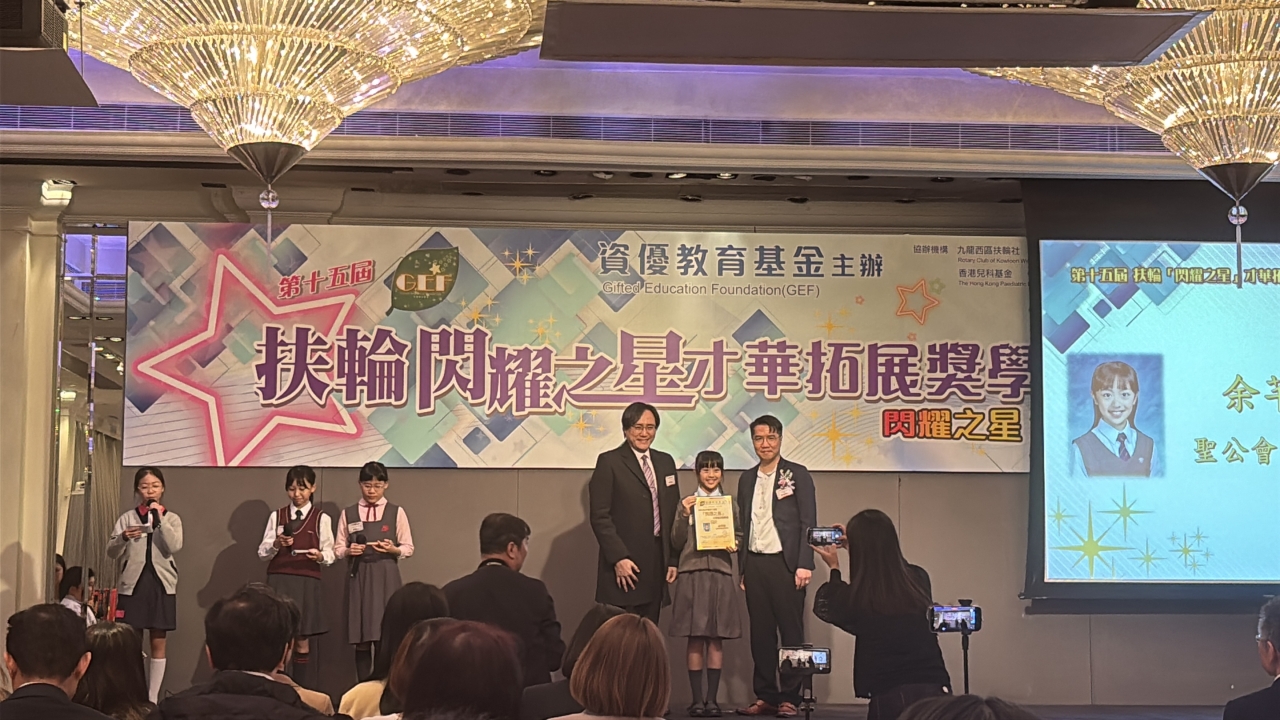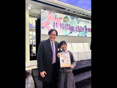由資優教育基金主辦,九龍西區扶輪社及香港兒科基金協辦的「『閃耀之星』才華拓展奬學金」已完成評審程序,我校6A余芊穎同學從全港212位資優生中脫穎而出,憑卓越表現獲得「『閃耀之星』才華拓展奬」,獲頒獎狀及獎學金港幣六千元,並將獲邀參與由社會人士提供的支援活動、學習工作坊及各類培訓課程。是次獲獎實在有賴同學的努力堅持及師長的悉心栽培,確是可喜可賀,期望芊穎繼續努力,盡展所長。